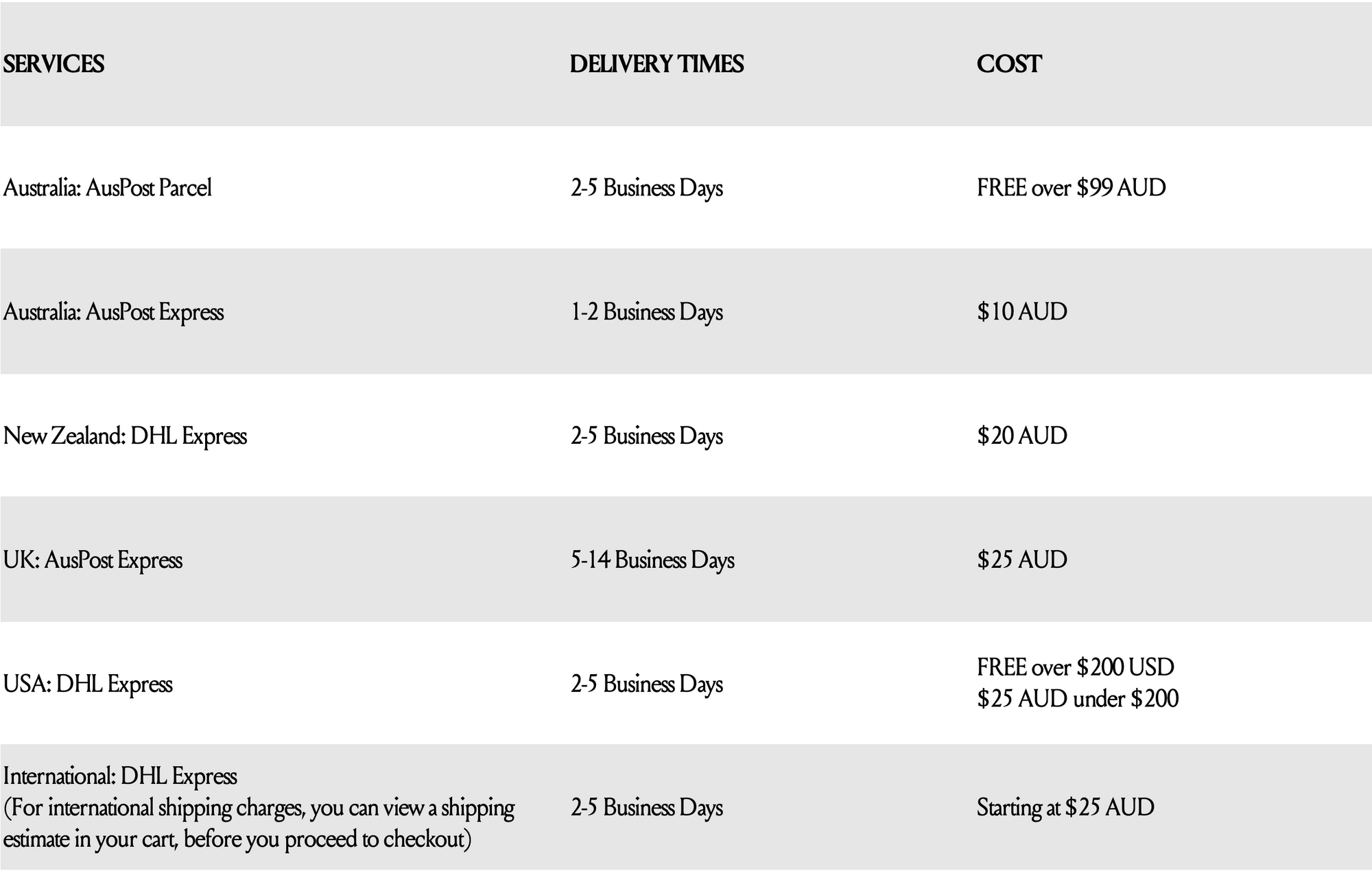 - For Australian orders shipped via AusPost parcel please allow 3-4 business days to receive your order.