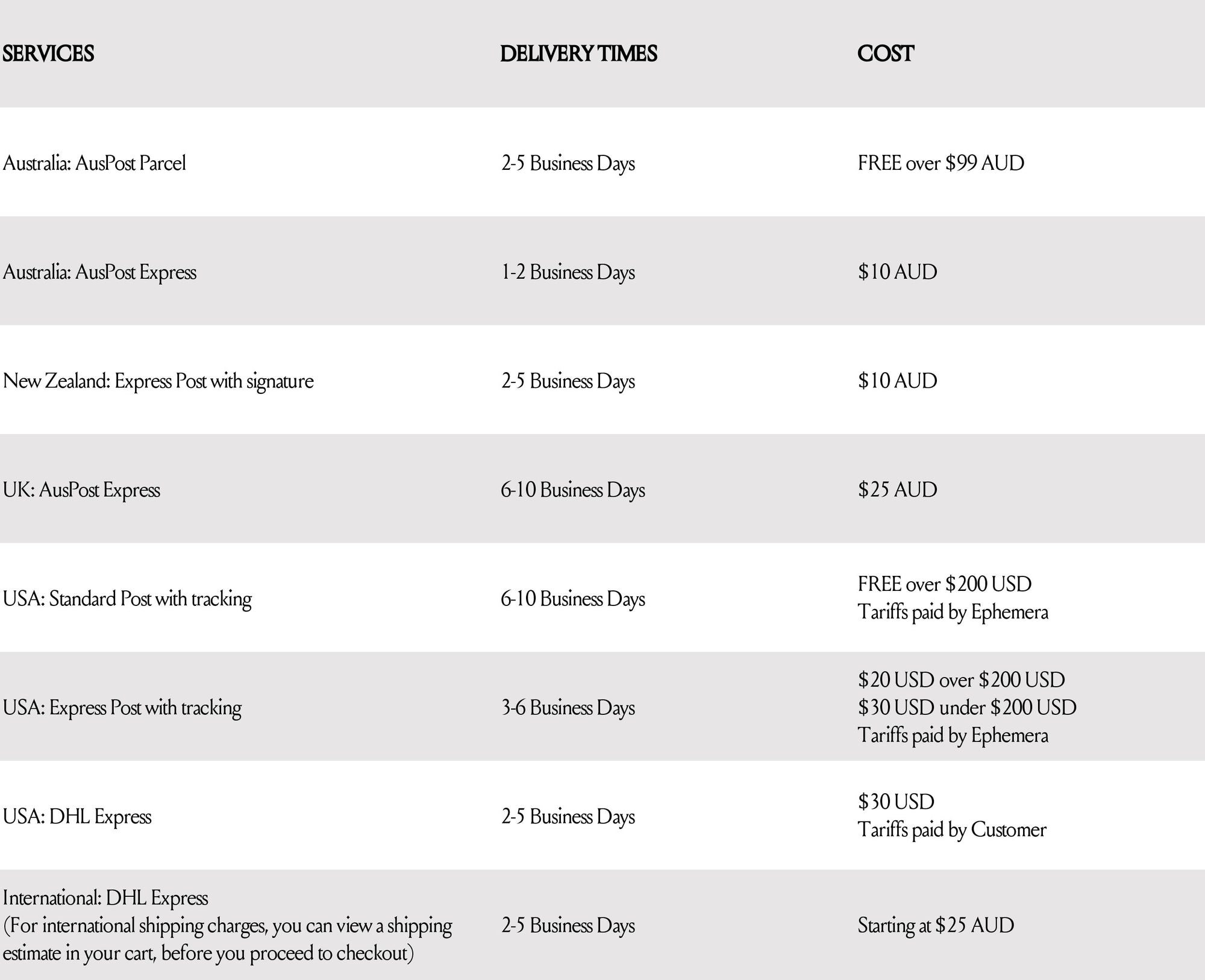 Shipments via the postal service are shipped on a Delivery Duty Paid (DDU) basis with all tariffs paid for by Ephemera. No additional charges will be billed to the customer.